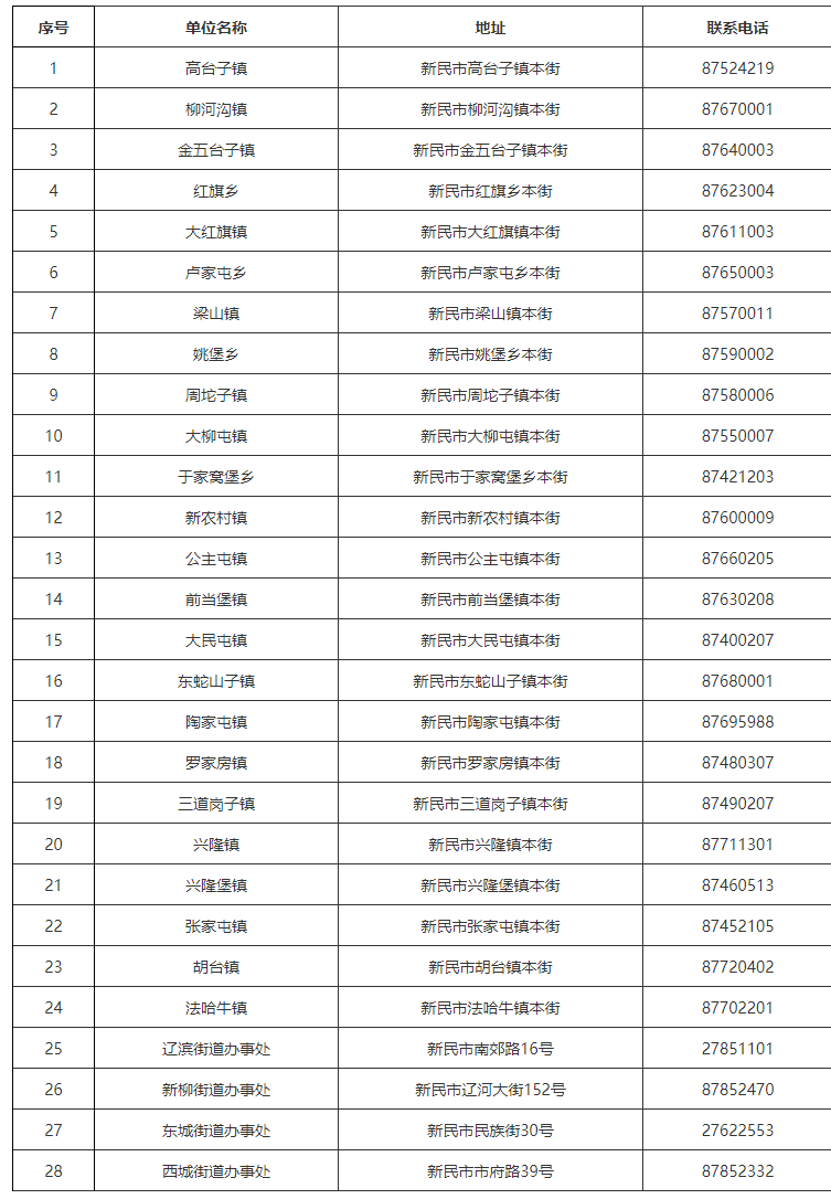 新民市辖区街道办事处、乡镇人民政府电话及地址大全表: