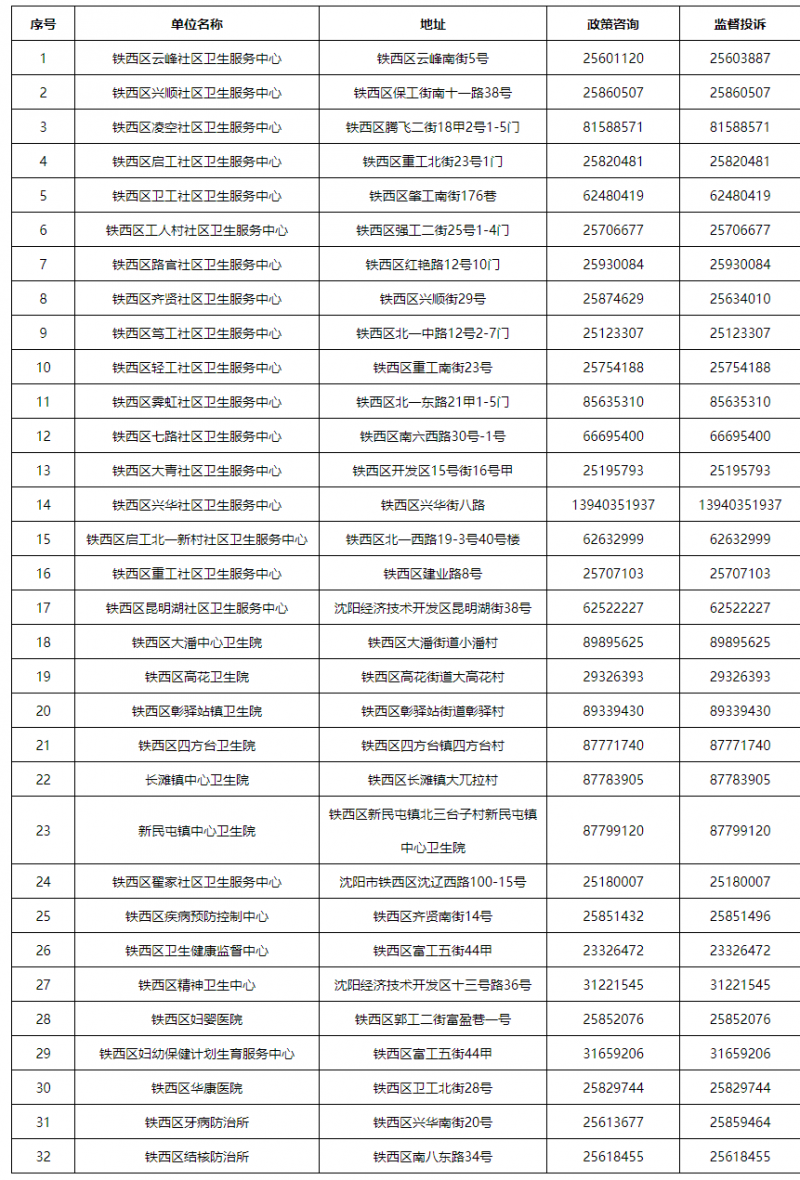 沈阳市铁西区辖区社区卫生服务中心、乡镇卫生院咨询电话及地址汇总表: