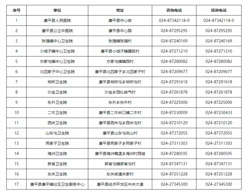 康平县基层医院(人民医院、中医院、乡镇卫生院、社区医院)地址电话大全表: