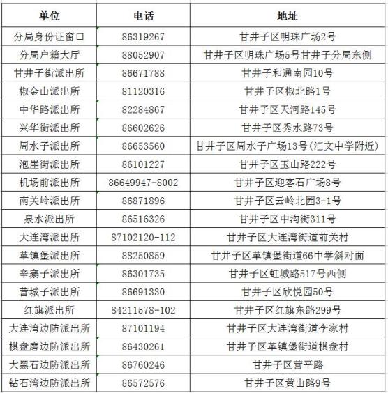大连市甘井子区辖区派出所户籍类业务咨询预约电话及办理地址大全表: