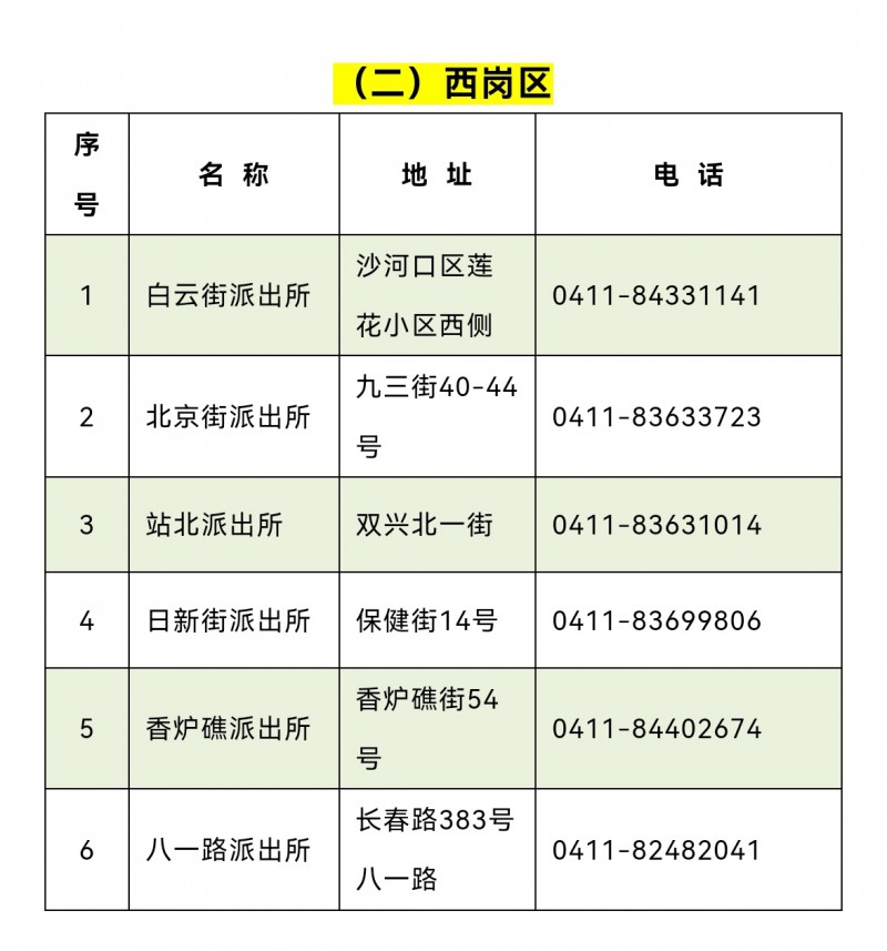 二,辽宁大连市西岗区辖区各派出所电话及地址信息汇总表: