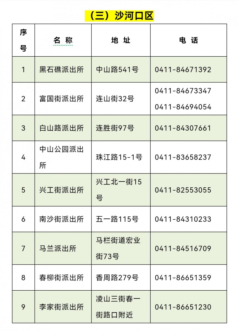 三,辽宁大连市沙河口区辖区各派出所电话及地址信息汇总表: