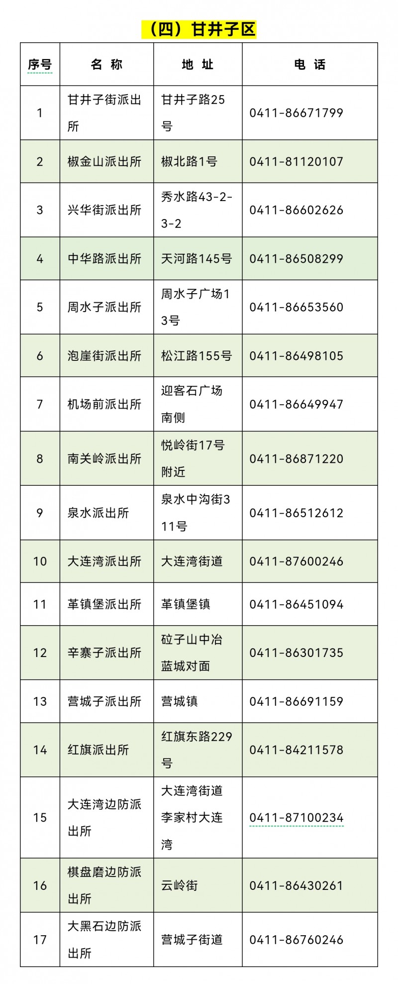 四,辽宁大连市甘井子区辖区各派出所电话及地址信息汇总表: