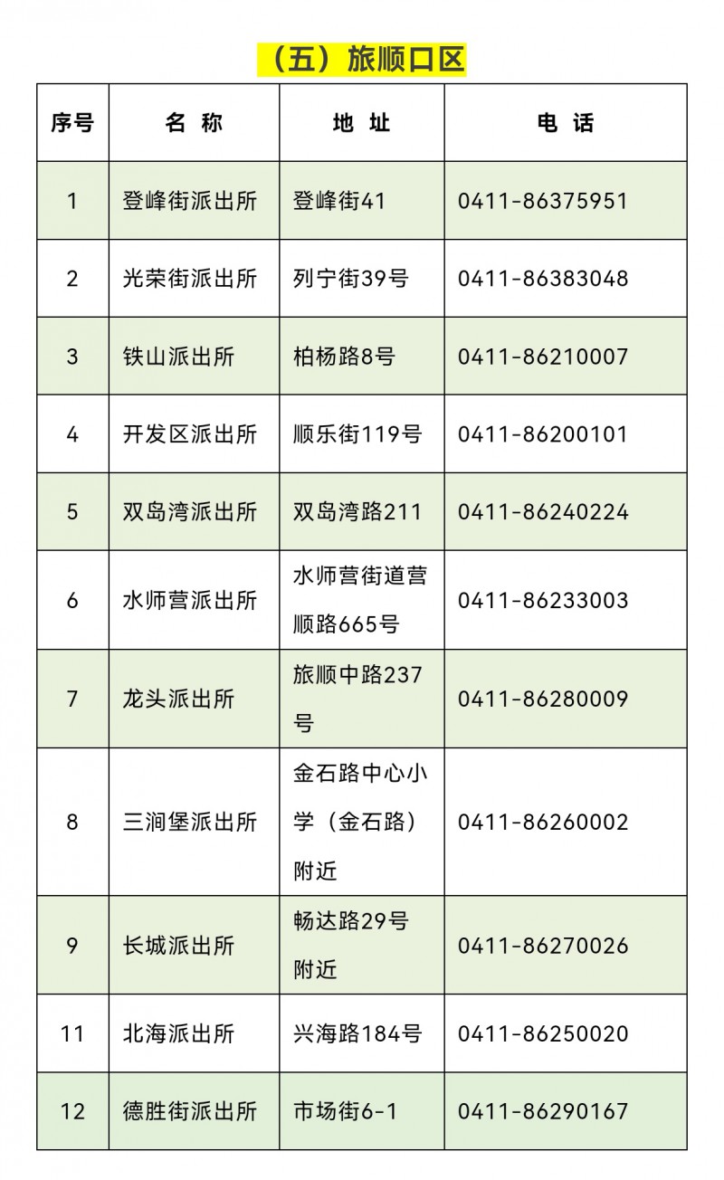 五,辽宁大连市旅顺口区辖区各派出所电话及地址信息汇总表: