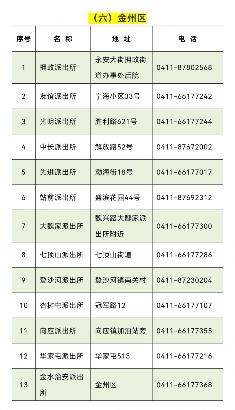 六,辽宁大连市金州区辖区各派出所电话及地址信息汇总表: