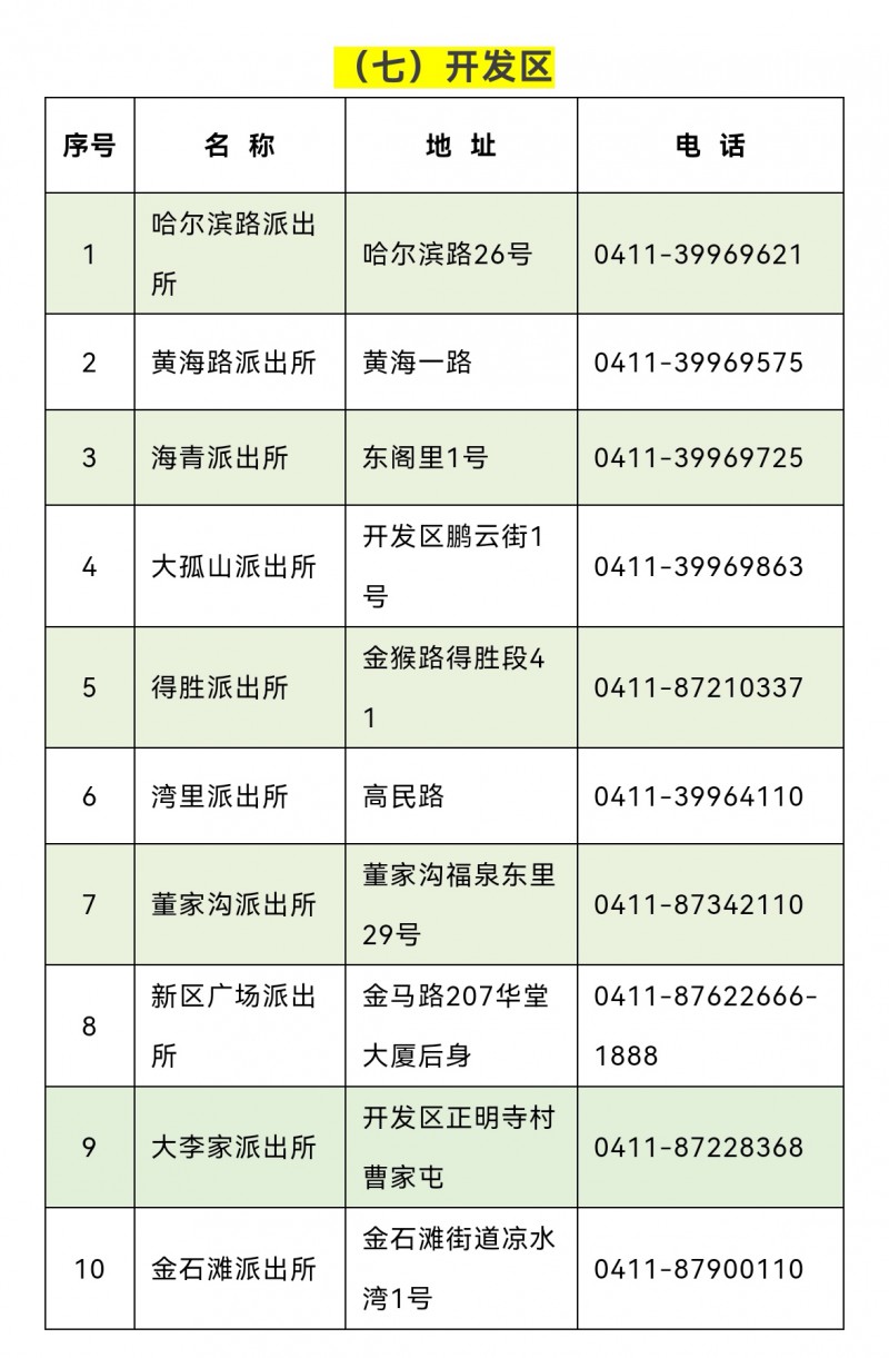 七,辽宁大连市开发区辖区各派出所电话及地址信息汇总表: