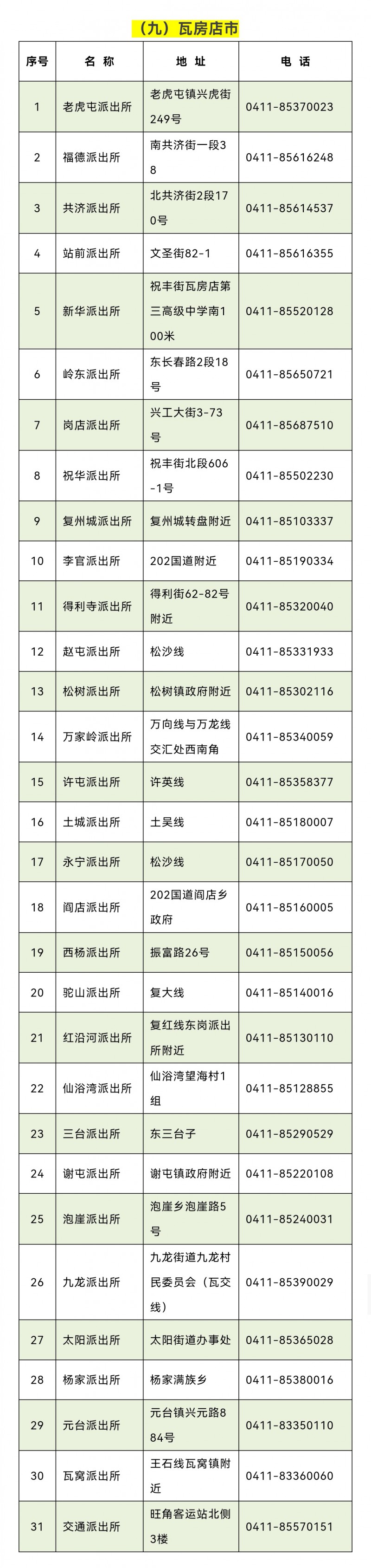 九,辽宁大连瓦房店市辖区各派出所电话及地址信息汇总表: