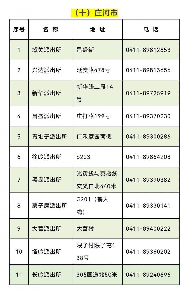十,辽宁大连庄河市辖区各派出所电话及地址信息汇总表: