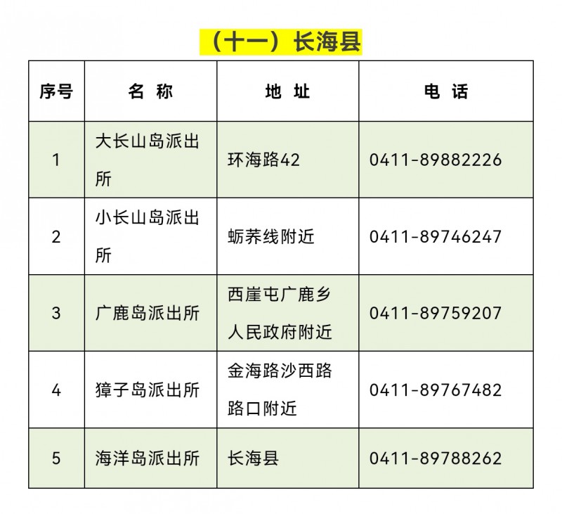 十一,辽宁大连市长海县辖区各派出所电话及地址信息汇总表:
