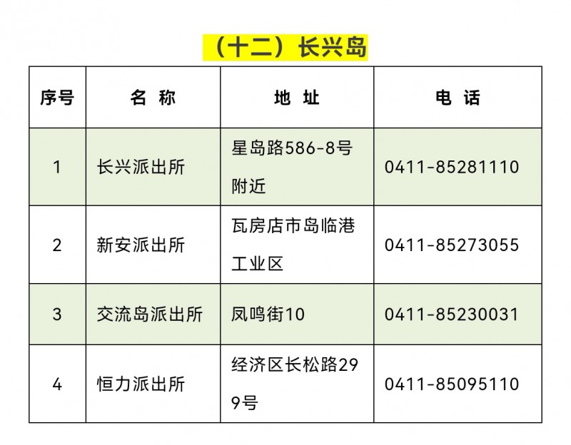 十二,辽宁大连市长兴岛辖区各派出所电话及地址信息汇总表: