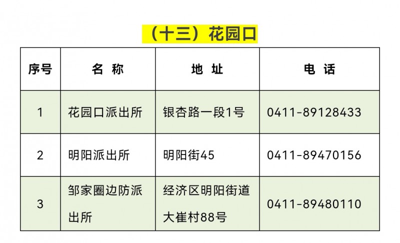 十三,辽宁大连市花园口辖区各派出所电话及地址信息汇总表: