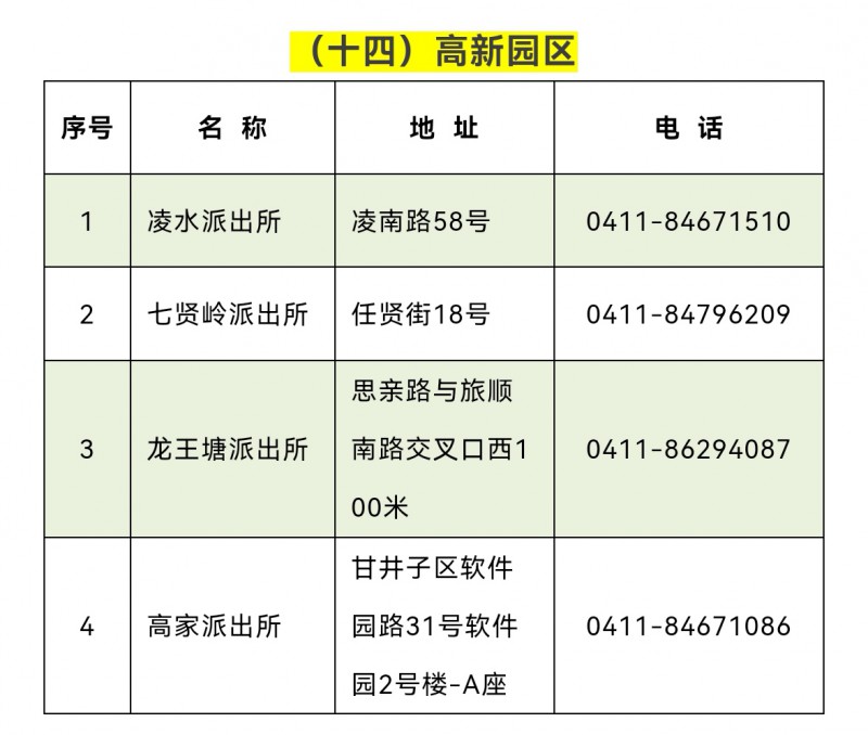 十四,辽宁大连市高新园区辖区各派出所电话及地址信息汇总表: