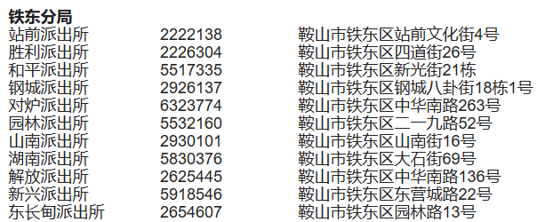 鞍山市铁东区辖区派出所联系电话和办公地址大全表: