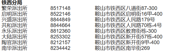 鞍山市铁西区辖区派出所联系电话和办公地址大全表:
