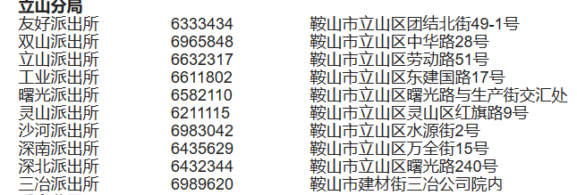 鞍山市立山区辖区派出所联系电话和办公地址大全表: