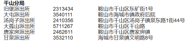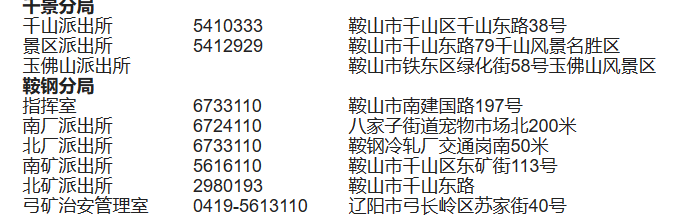 鞍山市千景分局和鞍钢分局辖区派出所联系电话和办公地址大全表: