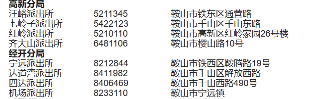 鞍山市高新区、经济技术开发区辖区派出所联系电话和办公地址大全表: