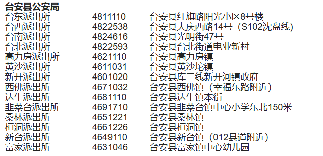 鞍山市台安县辖区派出所联系电话和办公地址大全表: