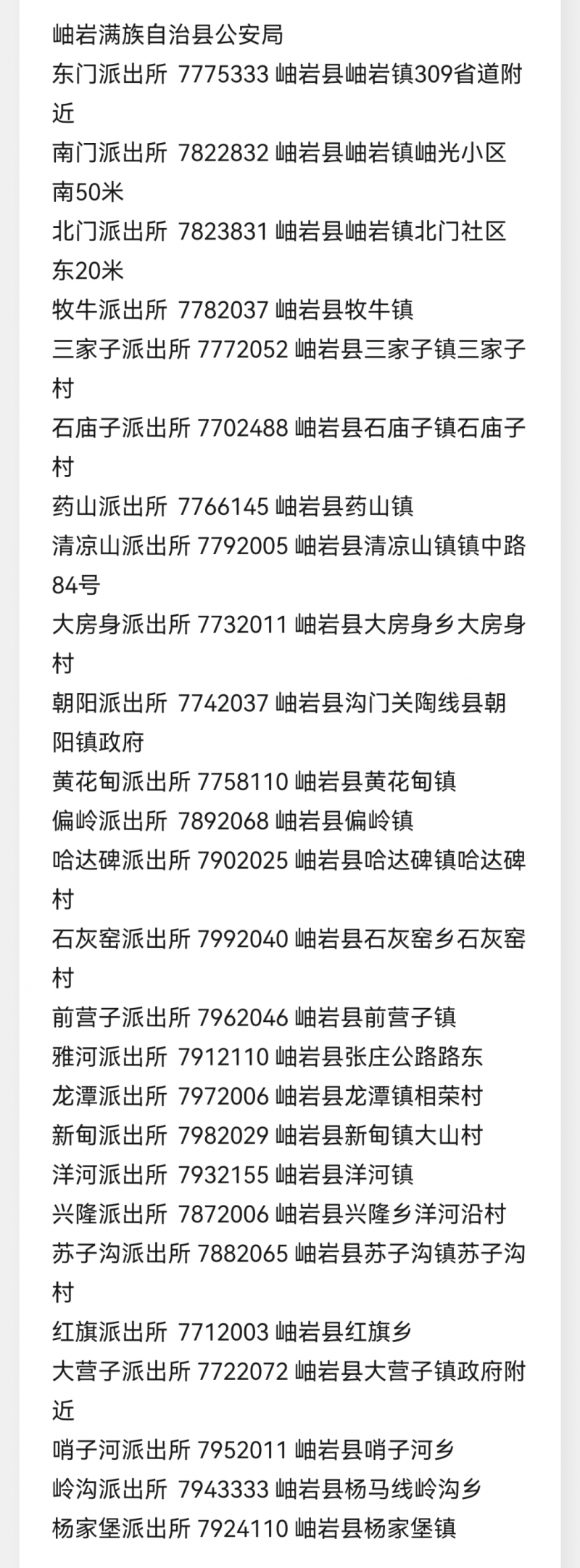 鞍山市岫岩满族自治县辖区派出所联系电话和办公地址大全表: