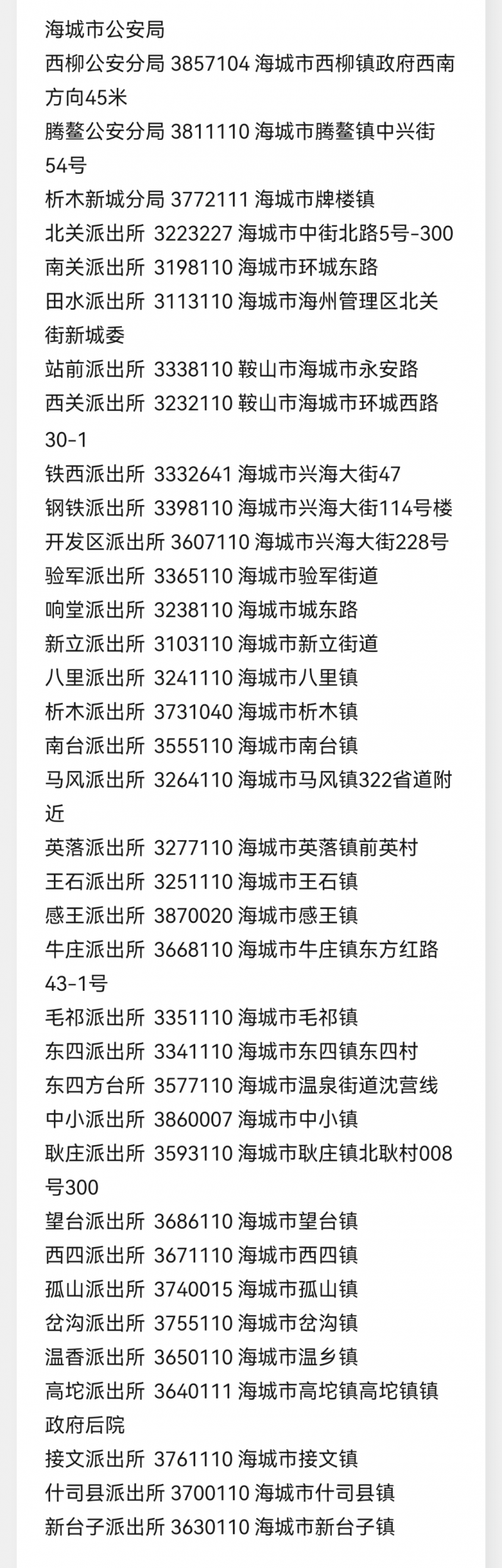 鞍山海城市辖区派出所联系电话和办公地址大全表: