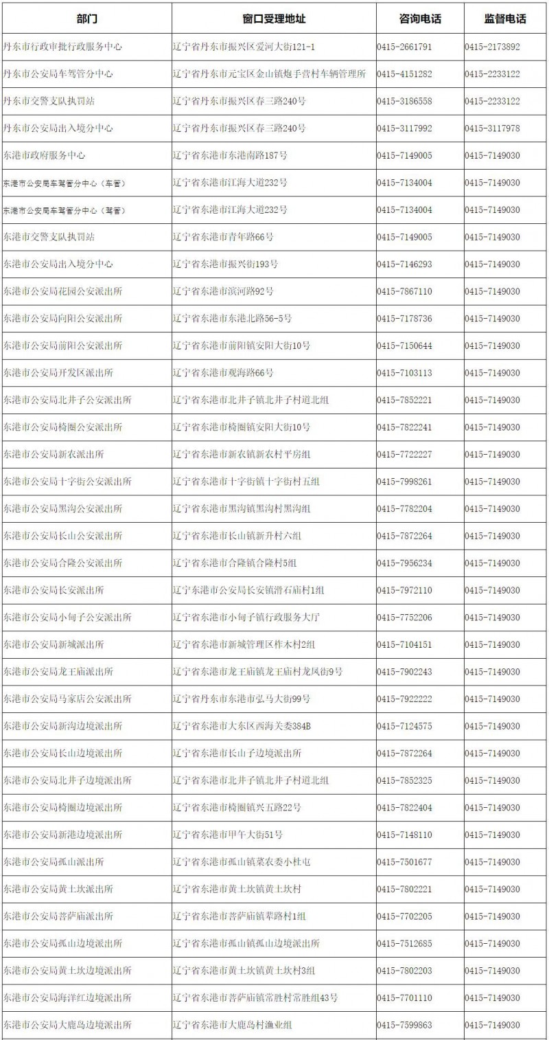 声明:关于丹东市各户政业务窗口咨询服务电话和地址大全表的信息作出免责声明,1,信息的源处为丹东市政府主管部门网站公开之内容,在这里整理及转发的唯一目的是为社会提供更多的便民利民网络信息。互联网的存在,让我们多了一个方便快捷的信息渠道,也是公共服务信息发布的渠道。