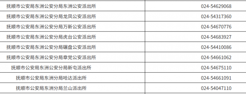 辽宁抚顺市东洲区辖区各派出所机构对外联系电话号码大全表: