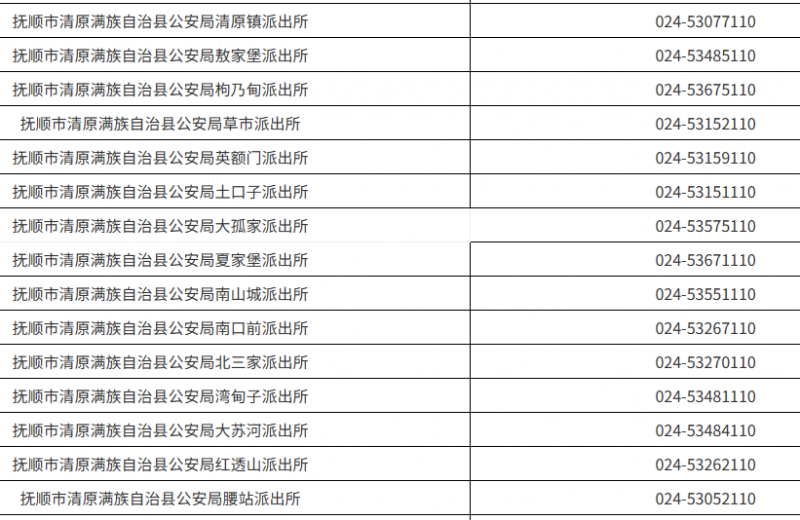辽宁抚顺市清原满族自治县辖区各派出所机构对外联系电话号码大全表: