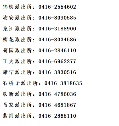 锦州市凌河区各派出所户籍窗口业务咨询预约电话汇总表:锦铁派出所、凌安派出所、龙江派出所、榴花派出所、菊园派出所、正大派出所、康宁派出所、石桥子派出所、铁新派出所、马家派出所、紫荆派出所。