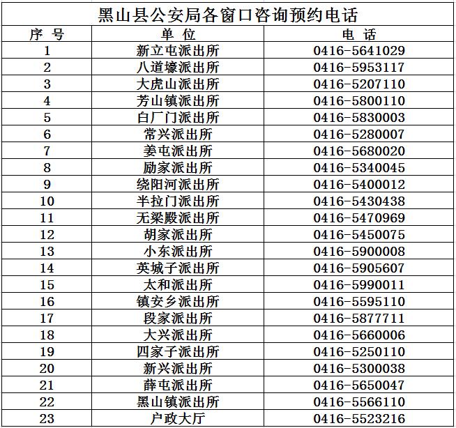 锦州黑山县辖区各派出所窗口咨询预约电话号码汇总表:锦州市黑山县辖区各派出所窗口将以坚决的态度、严格的举措、暖心的行动、无畏的担当,为全县百姓群众提供便捷的服务。