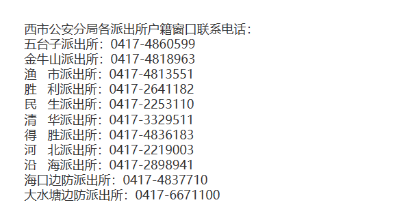 营口市西市区各派出所户籍窗口联系电话号码大全表,西市区各派出所户籍窗口联系电话:五台子派出所、金牛山派出所、渔市派出所、胜利派出所、民生派出所、清华派出所、得胜派出所、河北派出所、沿海派出所、海口边防派出所、大水塘边防派出所