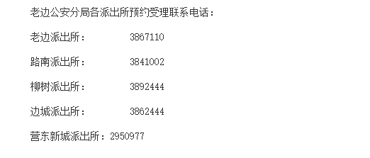 营口市老边区各派出所户籍业务咨询预约电话汇总表,老边区各派出所户籍预约受理联系电话:老边派出所、路南派出所、柳树派出所、边城派出所、营东新城派出所