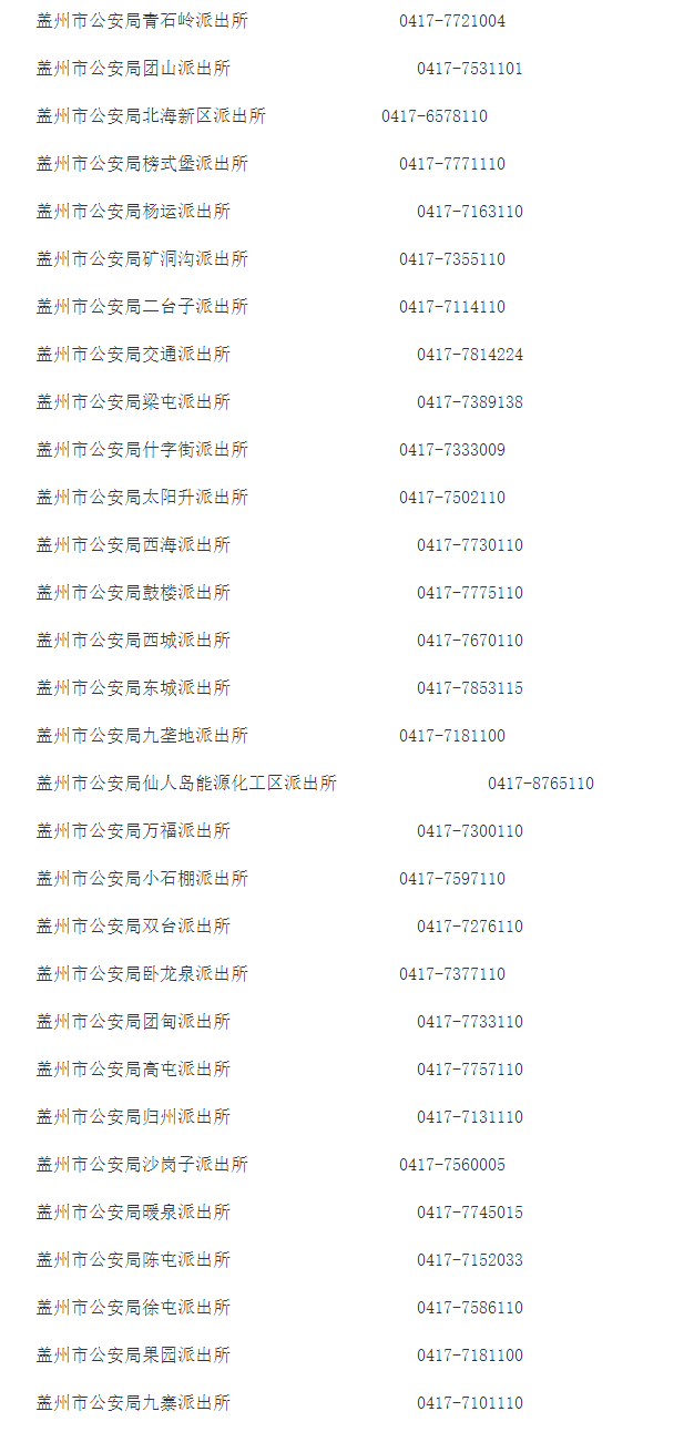 营口盖州市辖区派出所对外联系电话号码公开信息汇总表:在我们日常生活之中,众所周知,有困难找辖区派出所,在盖州市如何能够直接与你所在区域的派出所取得联系呢?在这里公布了盖州市辖区派出所联系电话汇总表,快收藏起来,以备不时之需。