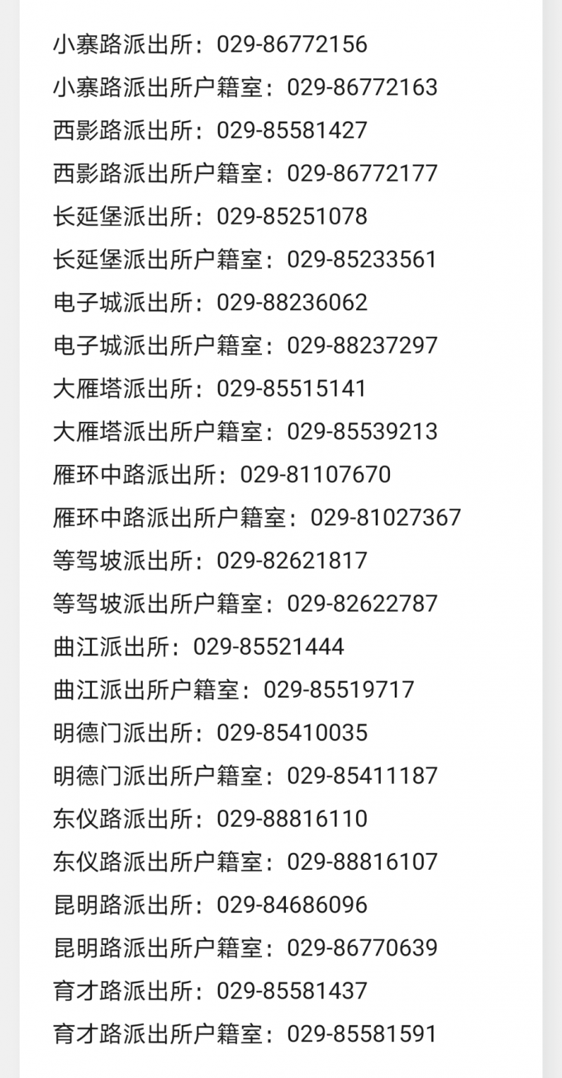 西安市雁塔区辖区派出所值班电话及户籍电话信息大全表: