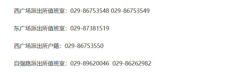 说明:关于西安市站前分局派出所联系电话汇总表的信息作出免责说明,信息来源于西安市政府主管部门网站公开之内容,整理转载此文是出于传递更多便民服务信息之目的。以上信息仅供参考,由于时间及其他方面的原因可能会发生变动,不准确之处请原谅!若有来源标注错误或者其它差错或侵犯了您的合法权益,请与本网站联系,我们将及时更正、删除。以上便民信息内容如有变更,以相关部门的更新内容为主。谢谢。