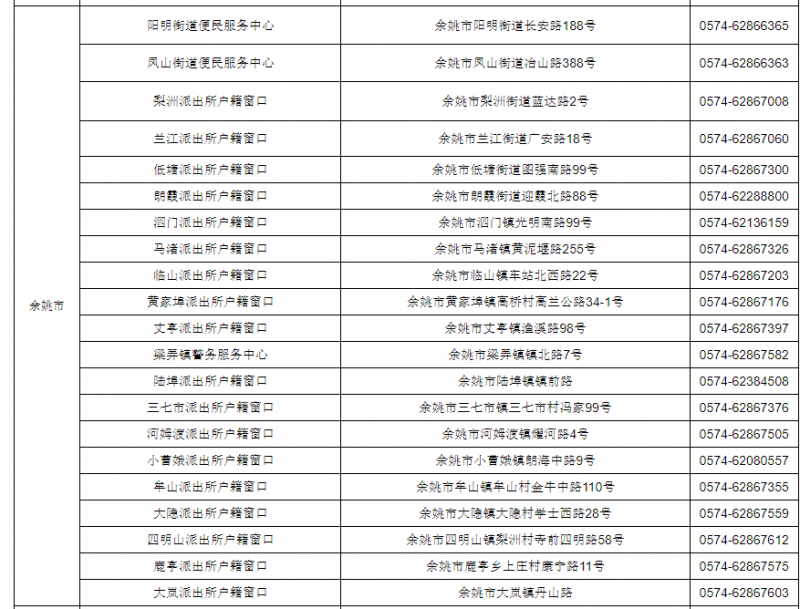 声明:关于浙江宁波余姚市辖区派出所、便民服务中心户籍窗口咨询电话及地址大全表的信息作出免责声明,信息来源于当地主管部门公开之内容,整理转载此文是出于传递更多便民服务信息之目的。以上信息仅供参考,由于时间及其他方面的原因可能会发生变动,不准确之处请原谅!若有来源标注错误或者其它差错或侵犯了您的合法权益,请与本网站联系,我们将及时更正、删除。以上便民信息内容如有变更,以相关部门的更新内容为主。谢谢。