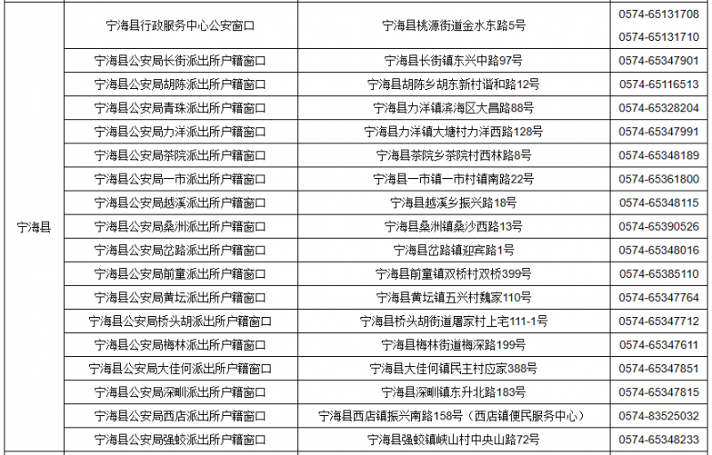 宁波市宁海县辖区各派出所户籍业务窗口咨询电话及办理地址大全表:宁波市宁海县辖区户口、居民身份证办理地址及咨询电话。