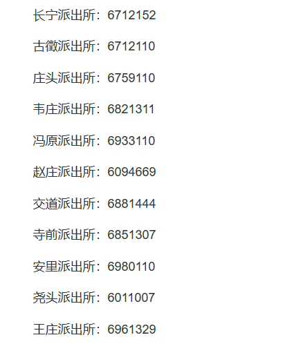 澄城县各派出所值班电话号码汇总表:长宁派出所、古徵派出所、庄头派出所、尧头派出所、韦庄派出所、寺前派出所、王庄派出所、冯原派出所、赵庄派出所、交道派出所、安里派出所。