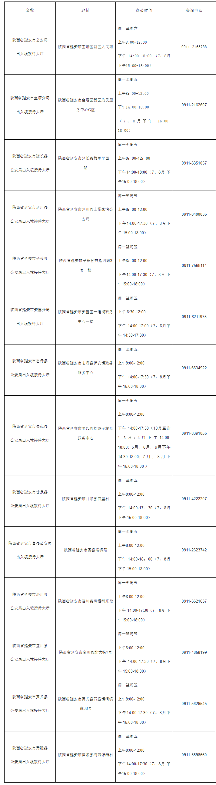 延安市辖区各出入境办事大厅地址和咨询电话大全表: