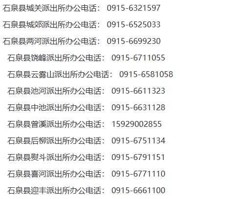 安康市石泉县辖区各派出所办公电话号码大全表:石泉县城关派出所办公电话、石泉县城郊派出所办公电话、石泉县两河派出所办公电话、石泉县饶峰派出所办公电话、石泉县云雾山派出所办公电话、石泉县池河派出所办公电话、石泉县中池派出所办公电话、石泉县曾溪派出所办公电话、石泉县后柳派出所办公电话、石泉县熨斗派出所办公电话、石泉县喜河派出所办公电话、石泉县迎丰派出所办公电话
