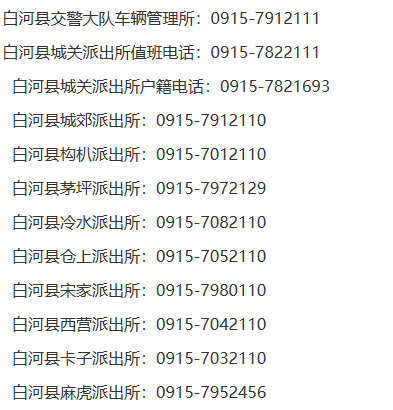 安康市白河县辖区派出所服务公开电话汇总表:白河县城关派出所值班电话、白河县城关派出所户籍电话、 白河县城郊派出所、白河县构朳派出所、白河县茅坪派出所、白河县冷水派出所、白河县仓上派出所、白河县宋家派出所、白河县西营派出所、白河县卡子派出所、白河县麻虎派出所