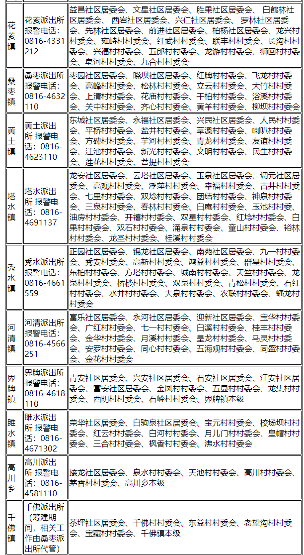 绵阳市安州区各派出所报警电话、办公地址和管辖区域信息大全表:
