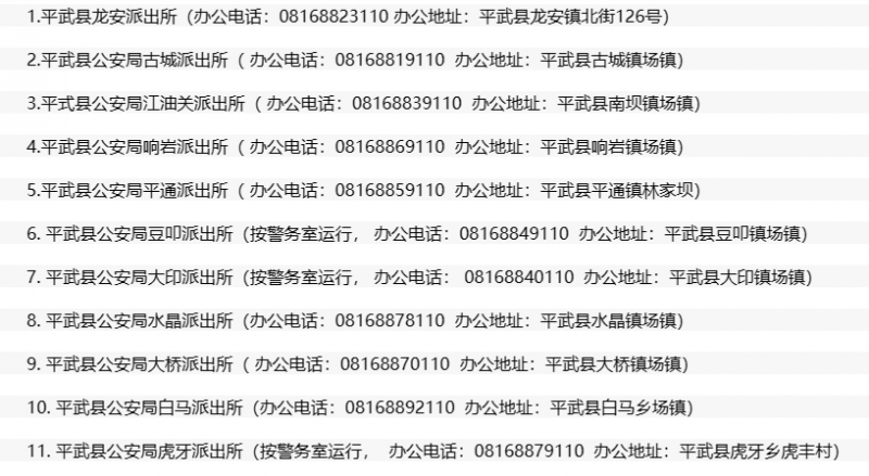 3.平式县公安局江油关派出所办公地址:平武县南坝镇场镇,
