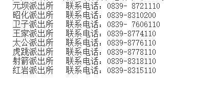 说明:关于广元市昭化区各派出所联系电话号码汇总表的信息作出免责说明,此信息来源于广元市昭化区政府网站公开之内容,整理转载此文是出于传递更多便民服务信息之目的。若有来源标注错误或者其它差错或侵犯了您的合法权益,请与本网站联系,我们将及时更正、删除,谢谢。