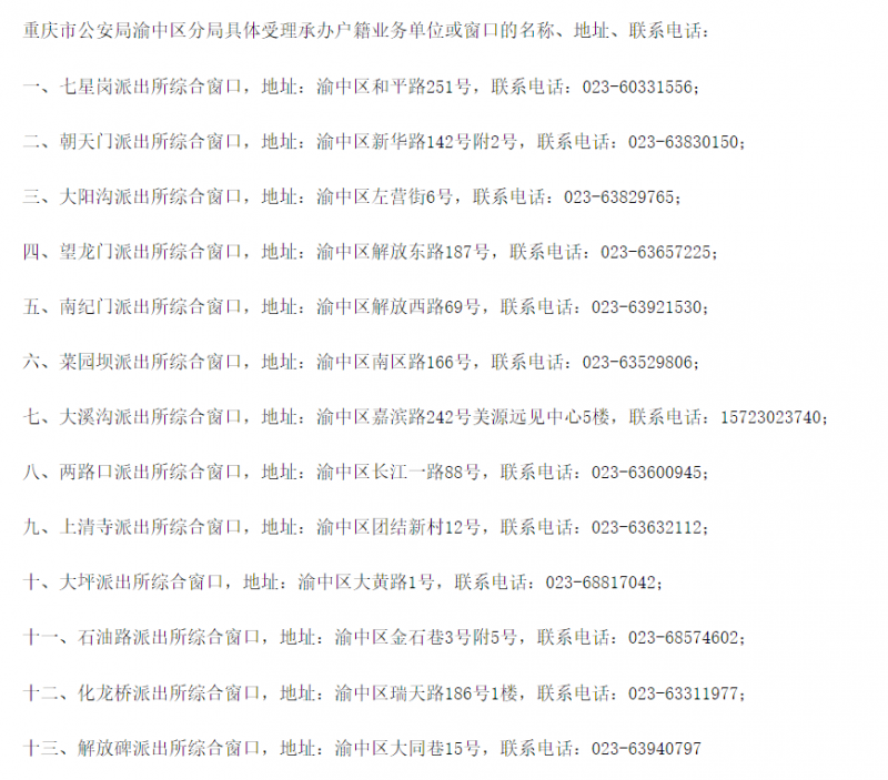 重庆市渝中区受理承办户籍业务派出所窗口的名称、地址、联系电话汇总表:接待时间:工作日工作时间, 9:00—12:30,14:00—18:00(法定节假日除外)。