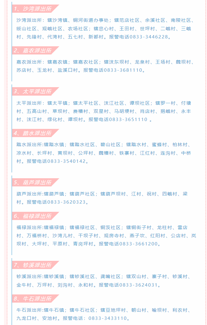 说明:关于乐山市沙湾区辖区派出所报警电话及管辖区域信息汇总表的信息作出免责说明,信息来源于当地主管部门公开之内容,整理转载此文是出于传递更多便民服务信息之目的。若有来源标注错误或者其它差错或侵犯了您的合法权益,请与本网站联系,我们将及时更正、删除。以上内容如有变更,以相关部门的更新内容为主。谢谢。