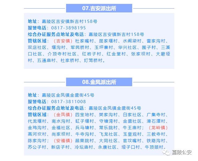 说明:关于南充市嘉陵区辖区派出所地址、报警电话和管辖区域信息大全表的信息作出免责说明,此信息来源于南充市嘉陵区政府主管机构公开之内容,整理转载此文是出于传递更多便民服务信息之目的。若有来源标注错误或者其它差错或侵犯了您的合法权益,请与本网站联系,我们将及时更正、删除,谢谢。
