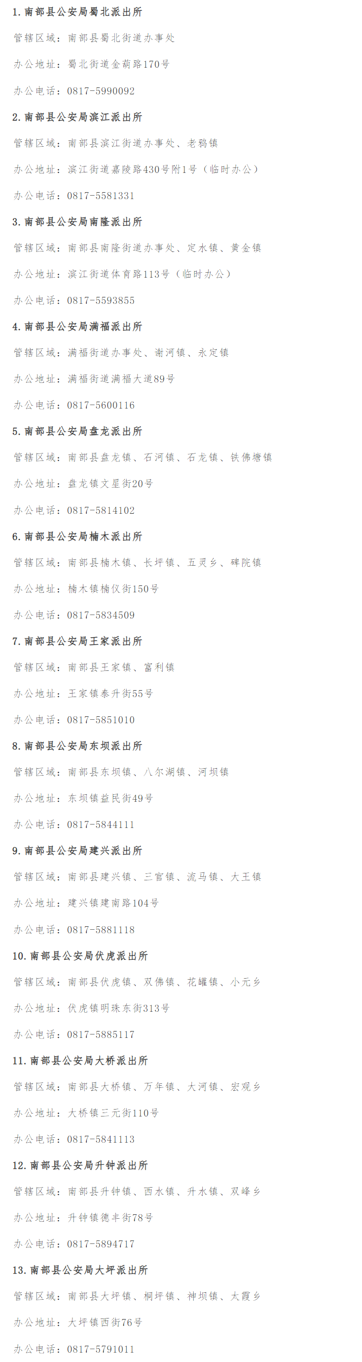 四川南充市南部县辖区派出所办公电话、办公地址和管辖区域信息汇总表: