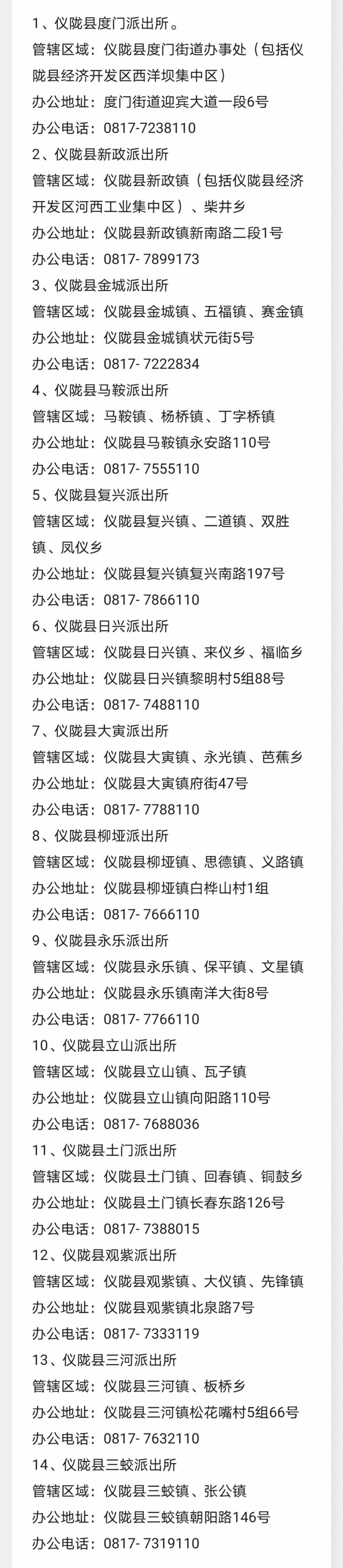 四川南充市仪陇县辖区派出所办公电话地址及管辖区域信息一览表: