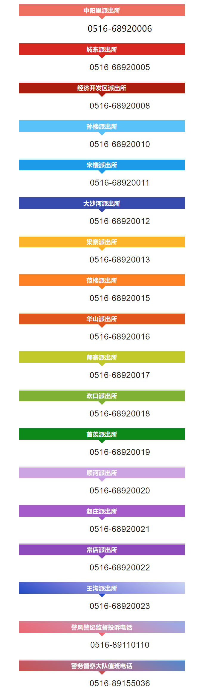说明:关于徐州市丰县辖区各派出所报警电话号码大全表的信息作出免责说明,信息来源于当地主管部门公开之内容,整理转载此文是出于传递更多便民服务信息之目的。以上信息仅供参考,由于时间及其他方面的原因可能会发生变动,不准确之处请原谅!若有来源标注错误或者其它差错或侵犯了您的合法权益,请与本网站联系,我们将及时更正、删除。以上便民信息内容如有变更,以相关部门的更新内容为主。谢谢。