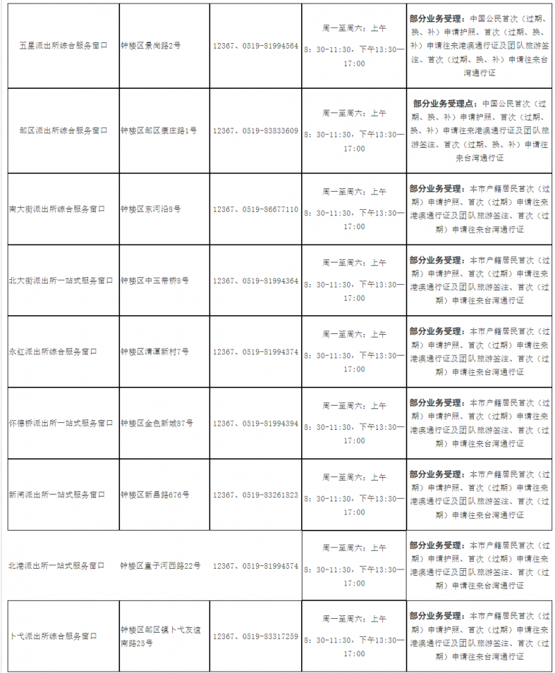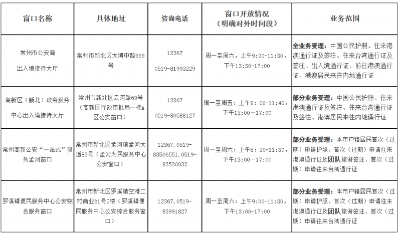 常州市辖区出入境证件办理窗口地址、咨询电话及办理业务范围一览表: